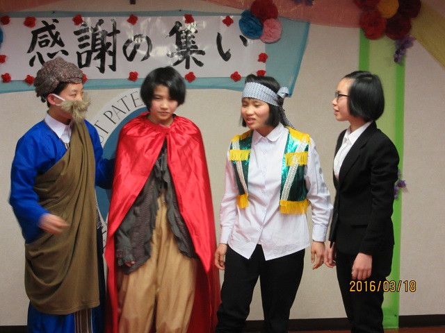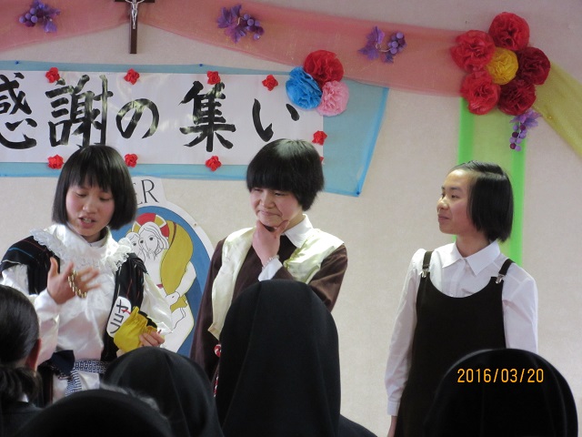 プログラムとしては、修学志願者4名による、「召命」についてのスピーチと「未来へ」の歌。またアスピラント3人による、ピアノやダンス、最後は全員による「放蕩息子」による劇を披露しました。修学志願者は日本に来て、4ヶ月経ったばかりですので、日本語が聞き手に伝わるよう、発音の練習から取り組みました。アスピラントのピアノは、Sr.エリザベット高谷の指導のもと4月から取り組み、ピアノを触る基礎から始めました。劇は、1月初めに台本を考え、1月末に完成させ、2月から練習に取り組みました。本番は、修学志願者・アスピラント皆、とても緊張していましたが、皆様の温かい見守りにより、無事に発表を終えることができました。この1年間、私たちを霊的・物的に支えて下さったシスター方、本当にありがとうございました。これからも、続けてお祈りをよろしくお願い致します。