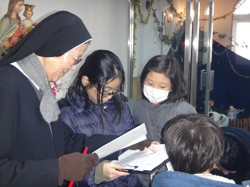 12月15日“クリスマスを迎える準備”を行いました。今年のCSSに参加してくれた友達とそのご家族を対象に呼びかけ、19名が参加してくれました。午前中は管区本部においてスモールクワイアの演奏とごミサ。近隣のシスター方も大勢参加してくださり、100名近い人数でミサを祝いました。午後からは楽しいゲームと近隣の馬小屋を訪問してのオリエンテーリング。子供たちは各ポイントの質問やみ言葉の問題に真剣に取り組んでいました。この真剣な姿をご覧ください!