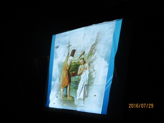 湖畔でのロザリオは、パワーポイントで玄義を映し出し、玄義をわかりやすくする工夫がされました。